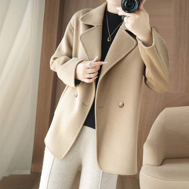 Wikkel jezelf in moeiteloze elegantie met deze camel-kleurige, dubbelrijige wollen mantel, ontworpen voor warmte en tijdloze verfijning. De gestructureerde pasvorm en zachte textuur maken het de perfecte laag voor zowel casual als geraffineerde looks.